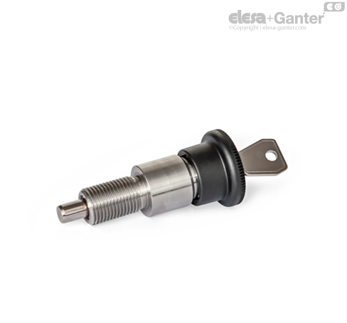 Lockable Stainless Steel-Indexing plungers GN 814 are used for applications where unauthorized operation is to be prevented. Types A and AK secure the plunger pin in the front position after locking. Types E and EK additionally secure the plunger pin in the rear position if it is not to protrude temporarily.