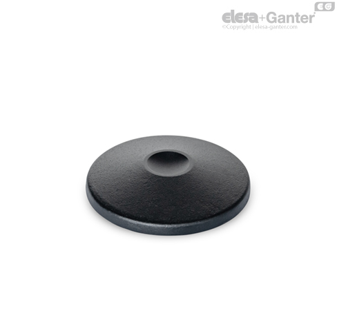 The foot plates are ideal for use with customized adjustment or compensation stems that have the spherically shaped absorption radius “r” at the contact point. DIN screws or threaded studs with chamfer or pointed nose used as an alternative reduce the load capacity due to the lack of full-surface contact.