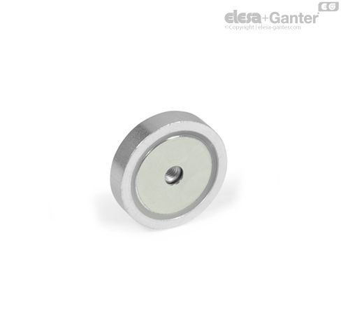 Retaining magnets GN 50.5 are combined with a steel housing and a plastic ring and the plastic cover into a system that shields and strengthens the magnet for optimal transmission of the magnetic flux onto the magnetic surface.