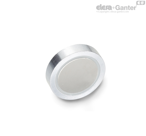 Retaining magnets GN 50.1 are combined with a steel housing and a plastic ring into a system that shields and strengthens the magnet for optimal transmission of the magnetic flux onto the magnetic surface.