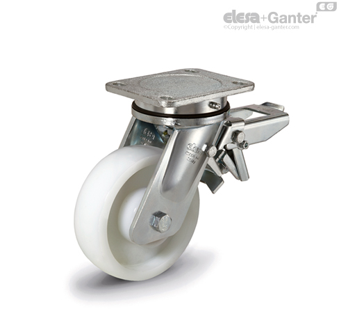 Электролитически оцинкованная электросварная сталь. Наличие осевого и конического подшипников обеспечивает отличную маневренность даже при полной нагрузке и увеличивает сопротивление кронштейна боковому воздействию. Он оснащен смазчиком и системой, предотвращающей ослабление затяжки контргайки. Оцинкованный стальной лист, кронштейн предназначен для выдерживания нагрузок до 9000Н. Подходит для тяжелых условий эксплуатации и промышленного применения (например, при столкновении и при высоких скоростях).