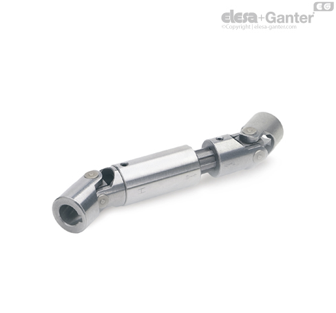Карданные соединения с игольчатыми подшипниками GN 808.3 не только компенсируют отсутствие соосности двух валов при вращении, но и позволяют расположить их на одной оси, что в зависимости от общей длины l1 обеспечивает необходимую длину вытягивания l2. Усилие передаётся через два карданных соединения DIN 808 (тип EW), шлицевый вал и скользящую муфту. При совмещении шлицевого вала важна точность: отметки «->», «<-» должны находиться друг напротив друга. Любая погрешность в соединении приведёт к неоднородности в передаче усилия и быстрому истиранию.
