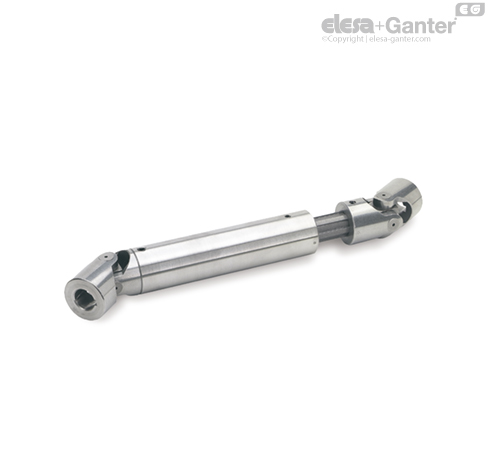 Карданные соединения с подшипниками скольжения GN 808.2 не только компенсируют отсутствие соосности двух валов при вращении, но и позволяют расположить их на одной оси, что в зависимости от общей длины l1 обеспечивает необходимую длину вытягивания l2. Усилие передаётся через два карданных соединения DIN 808 типа EG, шлицевый вал и скользящую муфту.