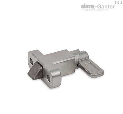 Пружинные защёлки GN 724.2 имеют штифт фиксатора с квадратным поперечным сечением, стопорную поверхность с одной стороны и фаску с другой. Когда предмет, подлежащий фиксации, перемещается к фаске, штифт фиксатора отодвигается назад в направляющую, позволяя канавкам и кромкам пройти над штифтом. Штифт фиксатора автоматически защелкивается на месте, когда перемещается к защелкивающей поверхности. Зажим можно разжать, потянув рычаг замка.