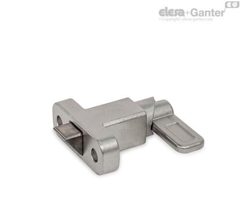Пружинные защёлки GN 724.2 имеют штифт фиксатора с квадратным поперечным сечением, стопорную поверхность с одной стороны и фаску с другой. Когда предмет, подлежащий фиксации, перемещается к фаске, штифт фиксатора отодвигается назад в направляющую, позволяя канавкам и кромкам пройти над штифтом. Штифт фиксатора автоматически защелкивается на месте, когда перемещается к защелкивающей поверхности. Зажим можно разжать, потянув рычаг замка.