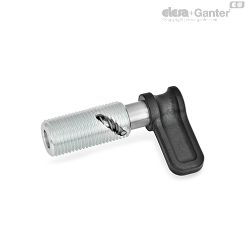 Рычажные фиксаторы с кулачковым механизмом GN 712.1 используются в тех областях применения, где штифт фиксатора должен выступать только иногда. При повороте кулачка на 90° или 120° против часовой стрелки фиксатор перемещается сквозь изогнутое отверстие в корпусе. После этого штифт фиксатора вытягивается.