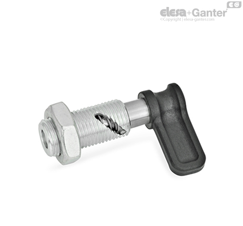 Рычажные фиксаторы с кулачковым механизмом GN 712.1 используются в тех областях применения, где штифт фиксатора должен выступать только иногда. При повороте кулачка на 90° или 120° против часовой стрелки фиксатор перемещается сквозь изогнутое отверстие в корпусе. После этого штифт фиксатора вытягивается.