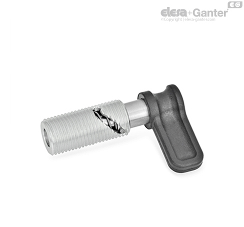 Рычажные фиксаторы с кулачковым механизмом GN 712.1 используются в тех областях применения, где штифт фиксатора должен выступать только иногда. При повороте кулачка на 90° или 120° против часовой стрелки фиксатор перемещается сквозь изогнутое отверстие в корпусе. После этого штифт фиксатора вытягивается.