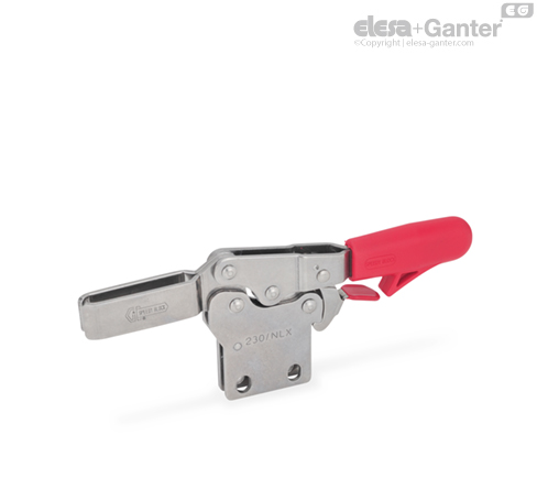 Горизонтальные шарнирные зажимы GN 820.4 оснащены предохранительнойфункцией: в закрытом положении зажим блокируется подпружиненным крючком-предохранителем, который предотвращает случайное открытие фиксатора вследствие вибраций или случайного нажатия. Для открытия зажима нужно потянуть рукоятку вверх, чтобы высвободить крючок-предохранитель из его паза. Все действия выполняются одной рукой.